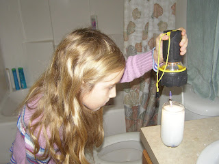 Violet learned about kinetic versus potential energy, the conservation of energy, and force this week. In addition to rolling the golf ball at different speeds to knock over dominoes, she enjoyed shooting Benny's Nerf gun at a target and figuring out the energy conversion involved, investigating tensile strength by comparing thread to rope, and using our scale to measure the force of her weight versus her ability to push on the scale versus the weight of a book.